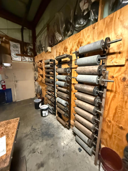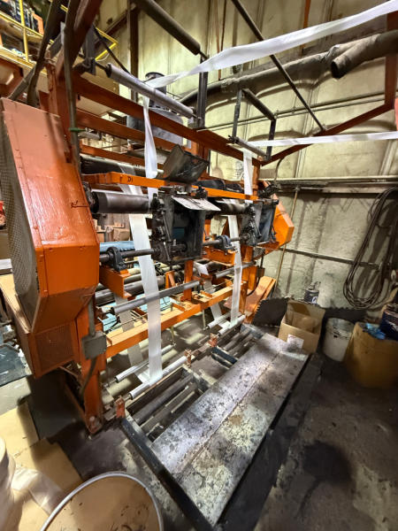 Holweg #IF525 (Modified) 4 Color Flexo Press, 38" Electric Heat Dryer, Edge Guide, Single Position Unwind & Rewind, 220V, 3 Phase w/Spare Roller Drums & Accessories