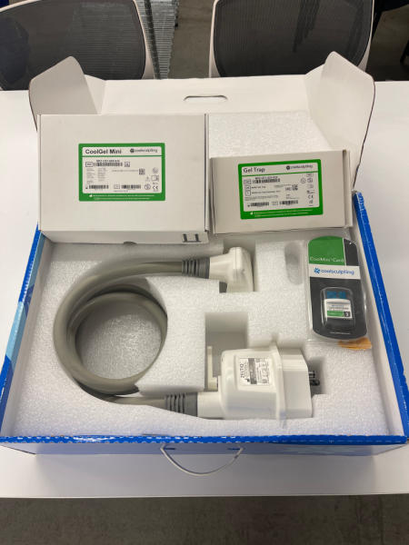 Cool Sculpting Cool Advantage Plus ZELTIQ Vacuum Applicator #BRZ-AP2-180-000, w/ (7) Gaskets, (8) Gel Traps, (2) Boxes Of Plus Pads, Box OF Pre Treat Wipes, (2) Comfort Straps
