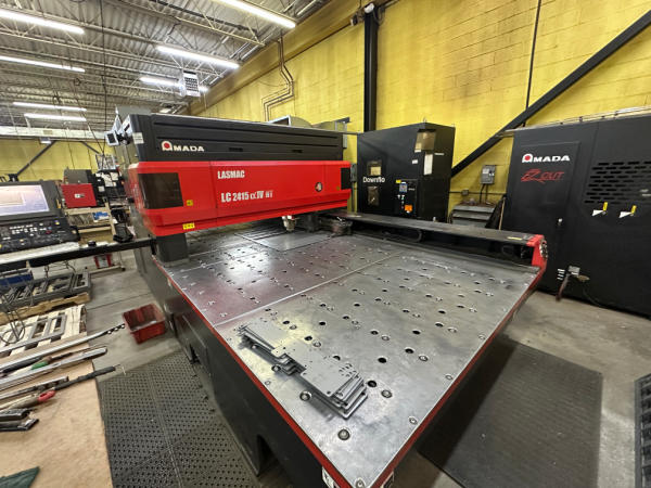 2007 Amada LASMAC LC2415 Alpha IV NT CNC Laser Cutting System, Fanuc AF4000E Resonator, Fanuc Laser C4000, Amada EZ Cut Model EZ-Cutter s/n EZ-0093, Down Flo Model ADF4 Dust Collector, 7.5 HP, Orion Model RKE15000A-VA-UU Inverter Chiller, Orion Model QSQ180W-11CA Air Dryer, Kaeser ASD40ST Rotary Screw Air Compressor