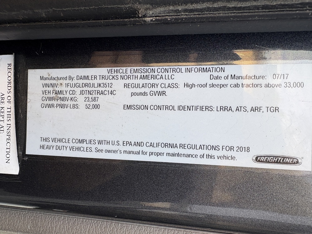 2018 Freightliner Cascadia Evolution 10 Wheel High Roof Sleeper Tractor w/ 52,000Lb GVWR, Automatic Transmission, Detroit 505Hp DD15 Motor, Odom: 525,130, VIN#: 1FUJGLDR0JLK3512